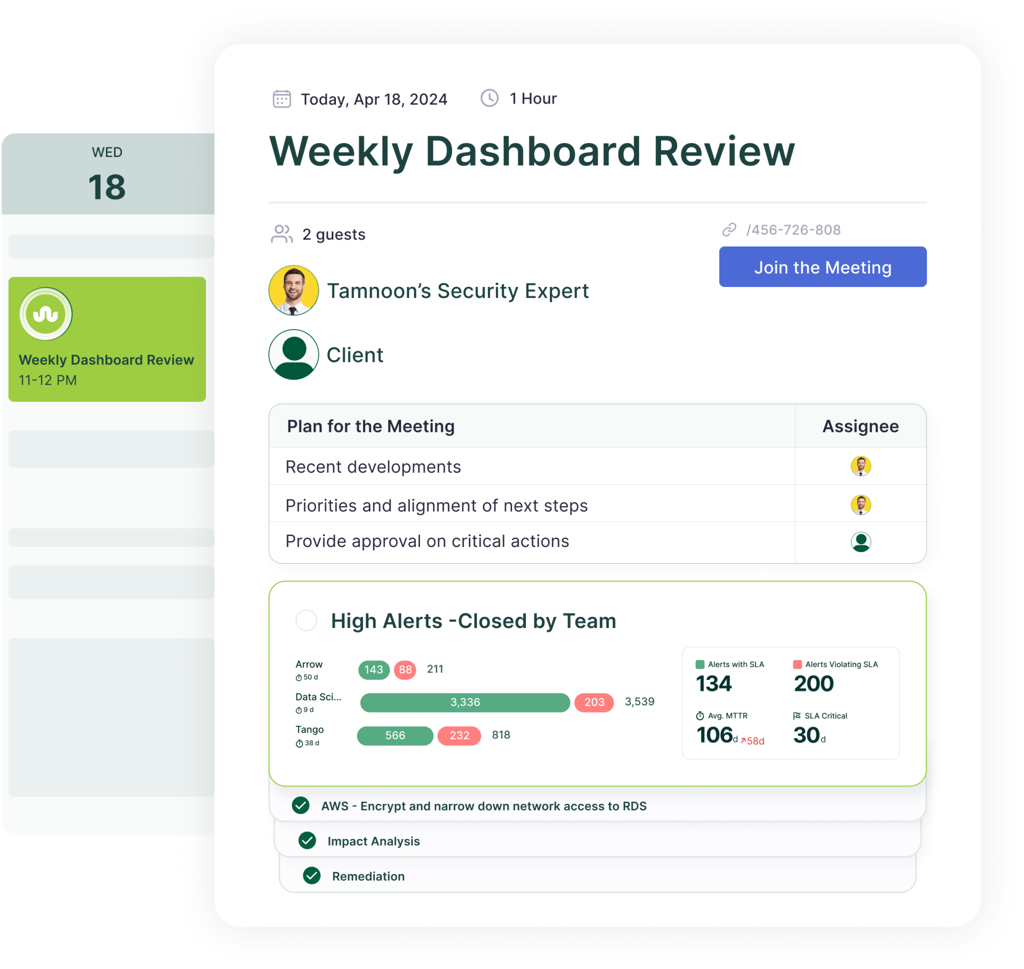 We sit down to align on your business needs and understand what’s essential to protect. Additionally we set the KPIs you’d like to achieve with Tamnoon.